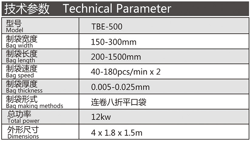 機器特性 此設(shè)備為生產(chǎn)連卷八折平口垃圾袋的專用設(shè)備,雙通道高速無拉伸底封好,收卷整齊,個數(shù)準(zhǔn)確,手動手卷。主動放料,薄膜張力穩(wěn)定此設(shè)備采用全鋼板一體而成,用電220v照明電即可。